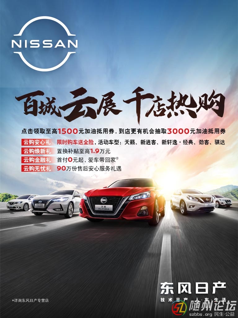 【買車選服務(wù)就到隨州東盛專營店,超值購VIP預(yù)約熱線:400-131-1415】 【NISSAN 百城云展 千店熱購】 【購天籟,逍客,軒逸經(jīng)典,勁客,騏達(dá)限時(shí)送全險(xiǎn)】 ①至高置換補(bǔ)貼1.9萬! ②網(wǎng)銷到店客戶專享精美禮品一份! ...