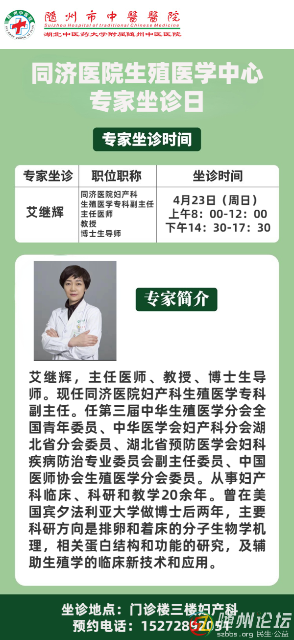同濟(jì)醫(yī)院生殖醫(yī)學(xué)中心”艾繼輝教授4月23日(本周日)來隨州中醫(yī)醫(yī)院坐診
