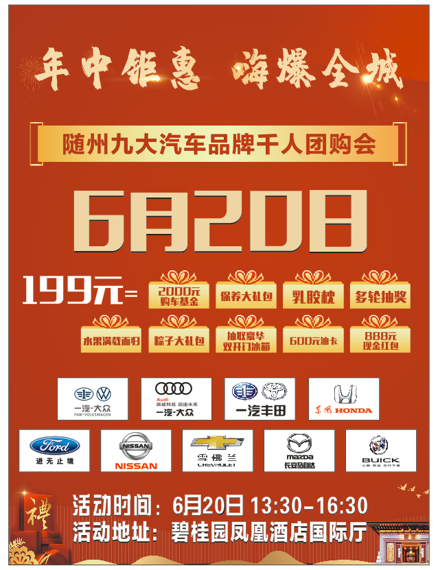 隨州九大汽車品牌聯(lián)合舉辦, 不必再東奔西跑到處比價(jià), 此次團(tuán)購會(huì), 只要您來,一定給您最滿意的價(jià)格! 空前盛惠,只等你來! 九店總經(jīng)理說了 放開價(jià)勢 優(yōu)惠大手筆 讓您搶占先機(jī)!